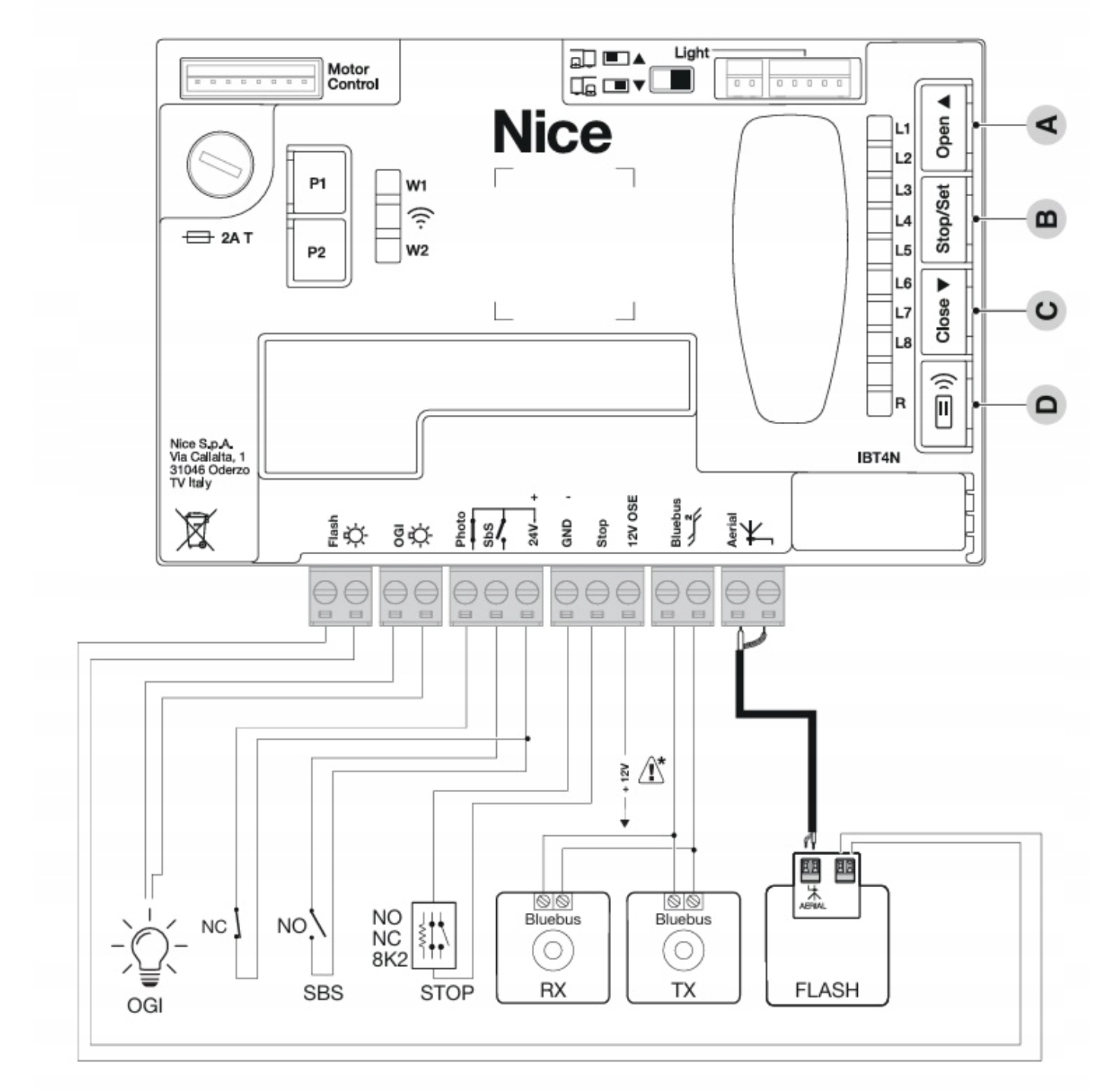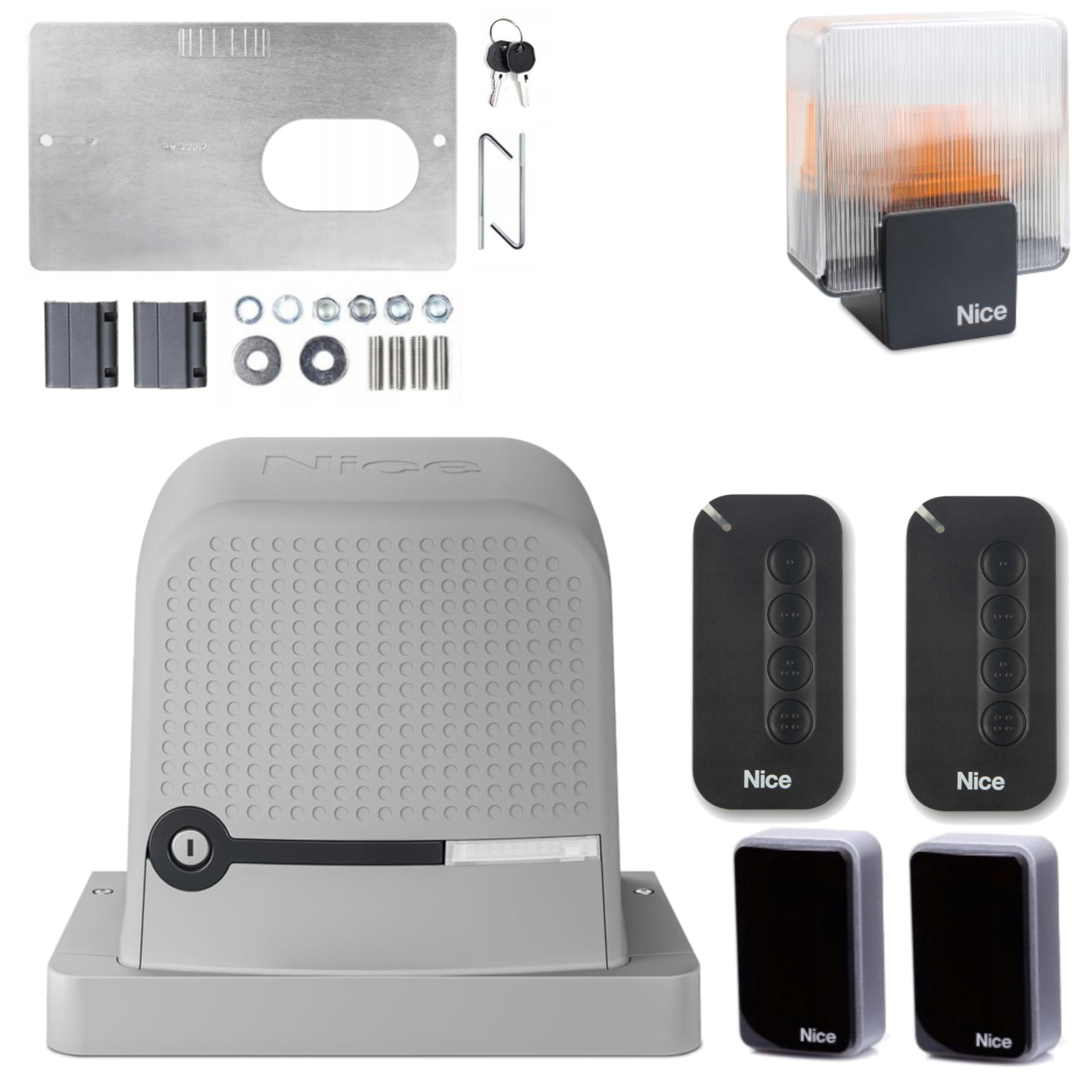 - Motoreduktor NICE ROBUS 600 z centralą MCU1 i wbudowanym radiem OPERA (Uwaga! Wbudowane radio obsługuje jedynie piloty ONE, INTI, MYGO. Starsze piloty można używać poprzez dołożenie radioodbiornika OXIBD do złącza radiowego wtecznie kompatybilnego)